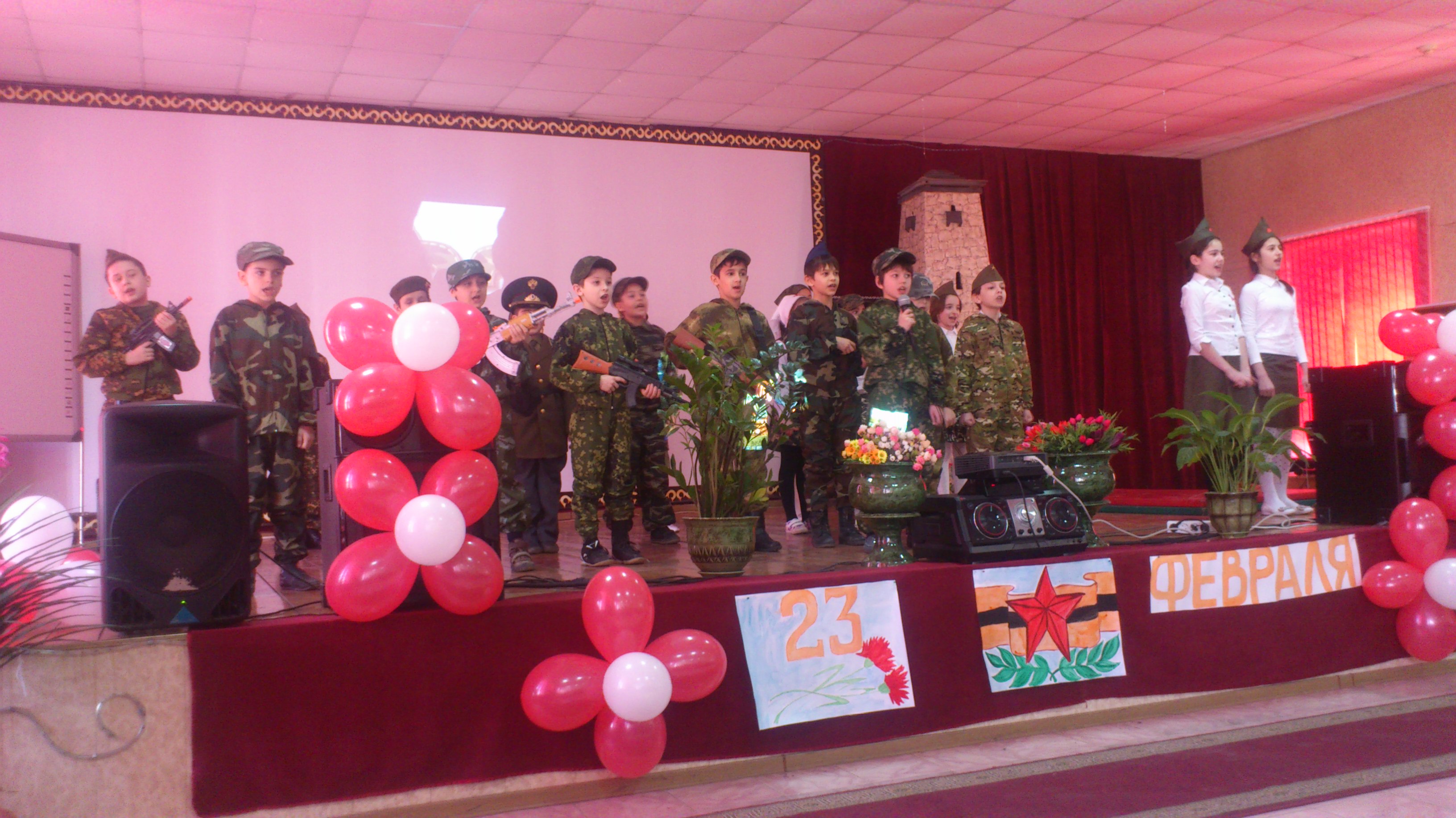24 февраля в МБОУ «СОШ№18» ученики начального и среднего звена поздравили учителей и родителей с Днем защитника Отечества. Воспитать любовь и уважение детей к Российской армии, формировать эмоционально-положительное отношение к войнам, которое выражалась бы в желании подражать в ловкости, быстроте, смелости и в патриотических чувствах. Все перечисленное являлось целью мероприятия. Мероприятие открыли ученики 3 «А» класса песней «Священная война». Батаев Магомед прочел стихотворение о войне. На праздничном концерте затронули тему ВОВ. Ведущие концерта ученики 5 «В» класса Шахгириева Раяна, Магомадов Амин, Масхудова Амина поочередно рассказали о черных днях нашей истории. Не забыли отметить трагические события 1994года. Зрителям продемонстрировали видео презентацию. Вспомнили павших в Афганской войне. Ученики 5 «В» класса инсценировали песню «Слава погибшим сыновьям» в исполнении Мадины Висаитовой ученицы 8 «Б» класса. Самым ярким выступлением была песня «Закаты алые», где солировала Дудаева Ирсана ученица 6 «Б» класса и наши первоклассники. Ученики 1 «А» одетые в военную форму хором пели песню, а на сцене учащиеся 5 «В» класса исполнили танец с тканью. В завершении номера на сцене образовался «Георгиевский бант» - символ героизма и славы защитников Отечества. Также 5 «В» класс показал номер с элементами боя и танцев. Зрителям рассказали о двух чеченских кампаниях, о том сколько погибло людей в этой войне. В концерте говорилось и о взрыве, что унес жизни 5 сотрудников полиции 5 октября 2014года и всех кто защищал Родину ценой своей жизни.