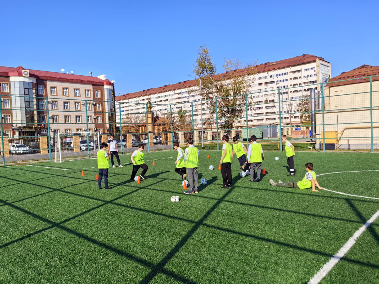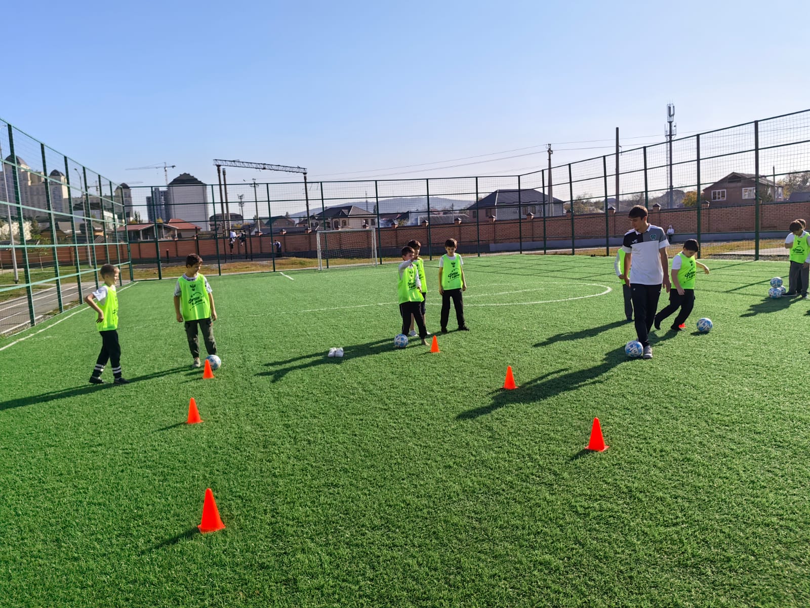 Действующий футболист футбольной команды АХМАТ провёл лёгкую тренировку для школьников а завершилось мероприятие товарищеской игрой.