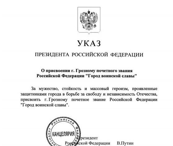 29.05.2015Почетное звание Российской Федерации "Город воинской славы" присвоено Грозному за мужество, стойкость и массовый героизм, проявленные защитниками города в борьбе за свободу и независимость Отечества. "Город воинской славы" - почетное звание Российской Федерации, установлено Федеральным законом 9 мая 2006 года. Звание присваивается городам Российской Федерации на территории которых или в непосредственной близости от которых в ходе ожесточенных сражений защитники Отечества проявили мужество, стойкость и массовый героизм, в том числе городам Российской Федерации, которым присвоено звание "Город-Герой". В городе, удостоенном звания "Город воинской славы", устанавливается стела с изображением герба города и текстом Указа Президента Российской Федерации о присвоении городу этого звания, а также проводятся публичные мероприятия и праздничные салюты 23 февраля (День защитника Отечества), 9 мая (День Победы) и в День города.